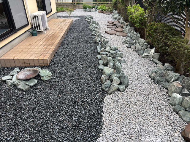 施工例■造園土木二羽 施工例25 ▲施工前 所沢市I様邸 既存の下草、芝、高木を撤去して一面に防草シートを敷き庭石と砂利での作庭依頼。 ▲施工後 三波石、戸隠石などを使い、画家である施主様の書いた図面を参考に作庭しました。 施工例■造園土木二羽 施工例24前の記事